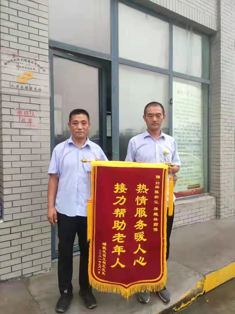 9月1日下午,在蟠桃花園站臺(tái)站有一位年邁的老人,手里緊緊握著一面書有“熱情服務(wù)暖人心,接力幫助老年人”的錦旗,在雨中等待著93路駕駛員陳新讓、蔣繼林的車輛,想要把這面飽含誠(chéng)摯謝意的“禮物”親手送給兩位師傅。
