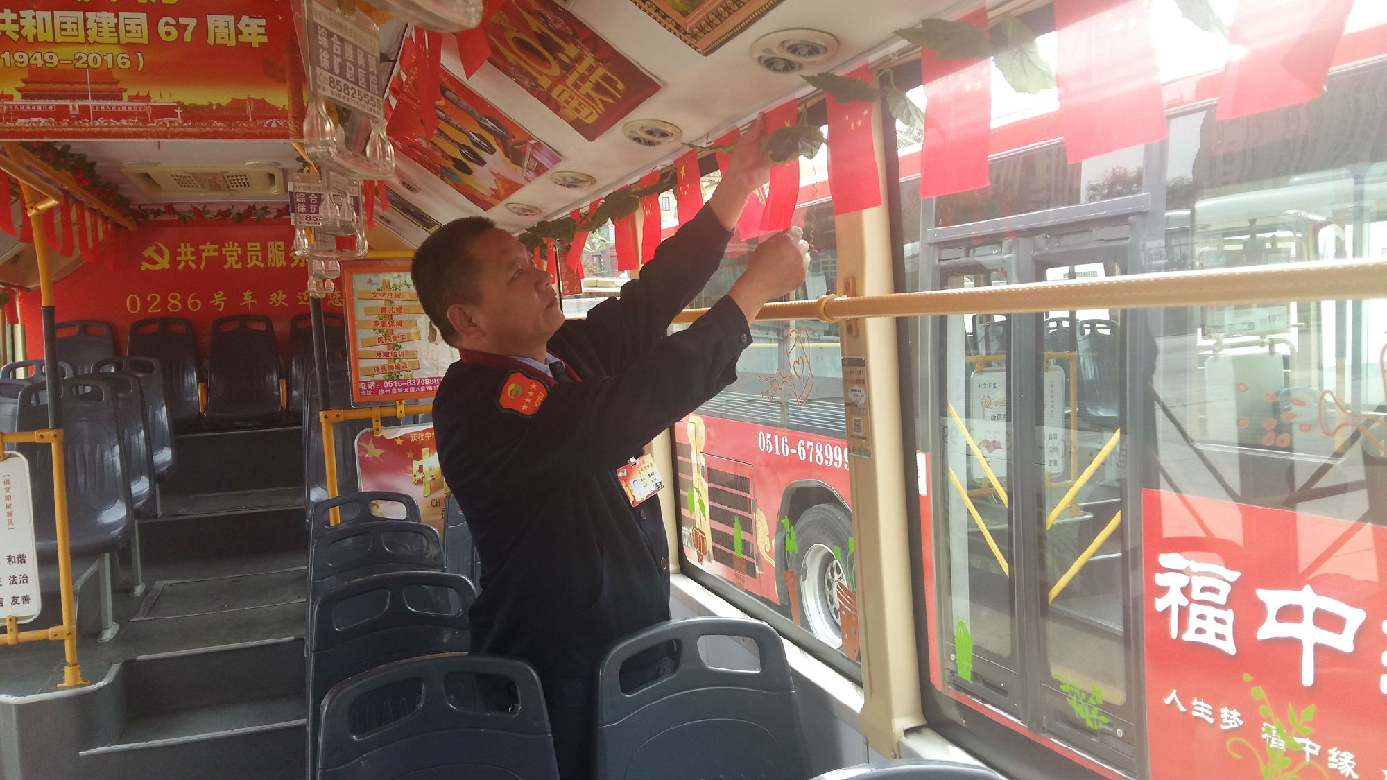 公交駕駛工作平凡、枯燥,但曹瑞國愛動腦、喜創(chuàng)新,總會給乘客不一樣的驚喜,感受不一樣的出行服務(wù)。適逢節(jié)日、活動,他總會換著花樣地自掏腰包,給車上乘客一個驚喜:春節(jié),購置小紅燈籠掛滿整個車廂,給乘客帶來濃濃的年味;母親節(jié),他準(zhǔn)備了100支康乃馨、祝???,送給“媽媽級”女乘客,道上一聲由衷的問候;今年七一,為慶祝建黨95周年,他準(zhǔn)備了95面黨旗,95本黨章,以及黨徽、紀(jì)念章給乘客,并在車廂廣播入黨宣言、革命紅歌;9月22日宣傳世界無車日,他制作了10個卡通宣傳牌,加班安裝在車廂四周,號召市民選用綠色交通工具出行,減少城市污染;十一,他將一百面國旗掛在車廂內(nèi),被媒體稱為“國旗哥”;10月9日重陽節(jié),為老年乘客發(fā)放免費鞋墊……
