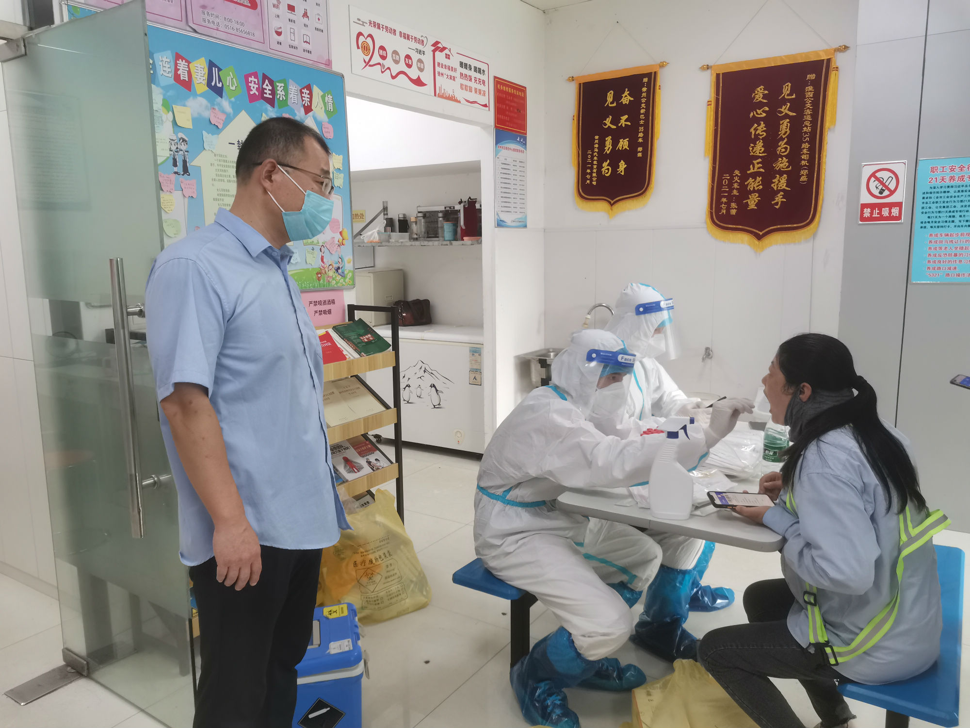 核酸檢測期間,新巴士公司各級管理人員做好后勤保障工作,經過亮碼認證、衛(wèi)生消毒、信息核對等程序后,職工才被獲準進入核酸采集室。同時,公司將空間較大的淮西客運站調度室作為采集點,并安排專職人員維持現場秩序。