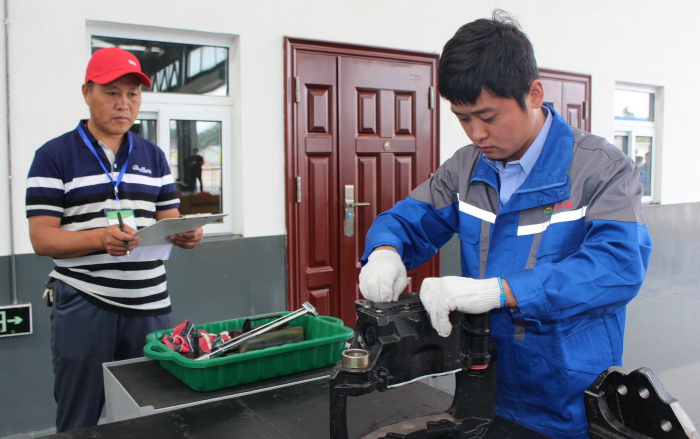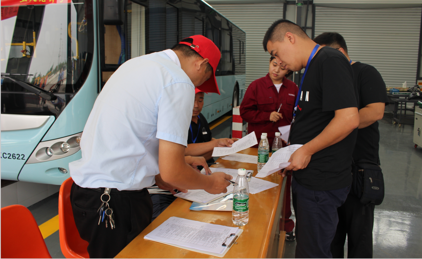 比賽開始了!參賽選手們穿戴整齊的工作服,個個卯足了勁,整裝待發(fā)。整潔的維修車間兩個工作臺上,四組修理人員同時進(jìn)行盤式制動器拆裝組合的項目比賽,四名裁判員認(rèn)真對照標(biāo)準(zhǔn)計分,現(xiàn)場安靜得只聽見制動器拆裝時輕微的“啪啪”聲。一旁的4個檢修地溝上,分別停著4輛新能源純電動公交車,同時進(jìn)行著新能源車電控故障排除項目的比賽。參賽人員時而在駕駛室時而在車廂尾部檢修電路,裁判員根據(jù)實際操作隨機(jī)提問、記錄。